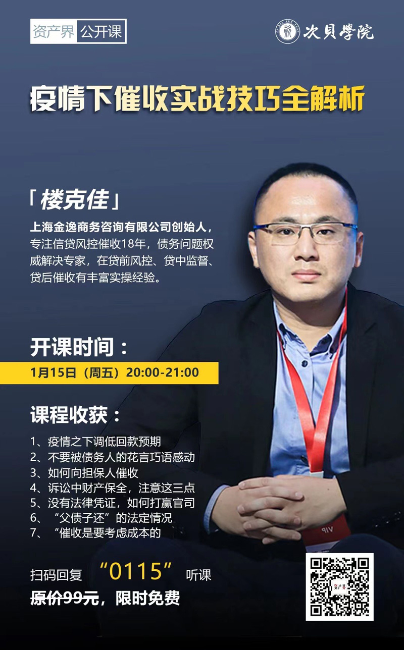 2021年1月15日樓老師直播課程:疫情下催收實戰(zhàn)技巧圓滿完成 掃描下方二維碼獲取視頻課程 你將收獲: 1.疫情之下調(diào)低回款預(yù)期 2.不要被債務(wù)人的花言巧語感動 3.如何向擔保人催收 4.訴訟中財產(chǎn)保全,注意這三點 5.沒有法律憑證,如何打贏官司 6."父債子還"的法定情況 7.催收是要考慮成本的
