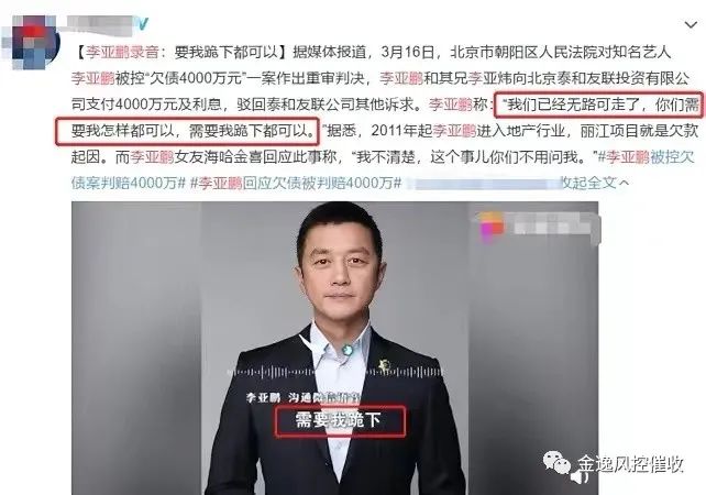 大家好,今天跟大家聊一聊李亞鵬欠款4000萬這個案件。最近法院終審判決李亞鵬這個官司輸了,李亞鵬欠款這個事情爆出來已經(jīng)有兩三年了,媒體上經(jīng)常報出來他欠款的新聞。 我在那時就判斷李亞鵬的這個官司肯定是輸?shù)?,他無非就是在拖時間。因為不去重審的話,法院馬上就要執(zhí)行他了,他有可能就要變成老賴上黑名單,還要被限制高消費,所以他就這樣一步步地再審、重審,就拖延時間,他可以一直說現(xiàn)在法院在打官司,我還沒有欠錢,不能去執(zhí)行他。 上海討債公司 7月6日法院終審判決李亞鵬要償還4000萬的本金和1000萬的利息,這個官司耗時非常長,從2015年到現(xiàn)在整整7年。所以官司真的是不打不知道,一打嚇?biāo)廊恕,F(xiàn)在是第一階段告一段落,花了7年終于可以去執(zhí)行了,如果李亞鵬現(xiàn)在不還錢的話,就可以申請強制執(zhí)行。 上海討債公司 債權(quán)人也說最近會啟動強制執(zhí)行這個措施,如果李亞鵬再不還就要變成老賴了。昨天晚上這個消息公布以后,李亞鵬也發(fā)了一個聲明,他說第一他會尊重法律,法律怎么判,他就怎么做。第二他強調(diào)了這是擔(dān)保,不是他的直接借款,他說他沒有問別人去借款,只是在公司生死存亡之際做了一個擔(dān)保。也就是說,他這個案件是云南麗江的一個房產(chǎn)公司問債權(quán)人借款,李亞鵬為其做了擔(dān)保。 如果說李亞鵬不擔(dān)保,人家會借給他名下公司錢嗎?不現(xiàn)實的。我們現(xiàn)實當(dāng)中有很多公司借款,實際控制人、個人大股東做個人連帶擔(dān)保責(zé)任,這都是很正常的,你公司要用錢,實際控制人不擔(dān)保,誰會借給你,肯定不會借給你。所以我覺得他這個聲明都是一些托辭。 之前我也講到過一個案子,網(wǎng)紅主播劉一手欠人家2300萬,法院也判決了,給他上了黑名單,他飛機高鐵都坐不了。后來他說我也不是問人家借錢,他說這是一個賠償款,我從老東家公司跳槽到新東家公司,可能存在違約的情況等,所以人家告我讓我賠2300萬。很多網(wǎng)民也說了,反正不管怎么樣,還是要尊重法律,法律判了你就必須去執(zhí)行,不管是借款擔(dān)??钸€是賠償款,我覺得這說的對,就不用再去強調(diào)各種理由。 上海討債公司 后來劉一手很快就把2300萬還掉了,他說之前他不懂法律開庭都沒有去,現(xiàn)在給他限制高消費了,他就知道法律的威嚴(yán)了,所以過了兩三天,他把錢湊好以后就還掉了。著名富二代王思聰也是,他的熊貓電競還有投資公司也有被曝出欠款,他這個欠款將近5億左右,還被限制高消費,現(xiàn)在也都應(yīng)該是解決了,不然的話他都不能出去坐飛機,坐高鐵,所以現(xiàn)在李亞鵬首先要面對的還是還錢。 那么從債權(quán)人這個角度來講,我不知道他們是否查到李亞鵬名下有資產(chǎn),因為起訴之前可以先查封他名下的資產(chǎn),進行訴訟保全。但是也有一種可能,就是打官司之前他把資產(chǎn)變賣或者轉(zhuǎn)移了,所以我不知道他們是否查到李亞鵬名下有什么資產(chǎn),如果有房子有車子,現(xiàn)在強制執(zhí)行以后可以申請拍賣,這種情況也是有可能的。 強制執(zhí)行以后看他怎么去還債,因為現(xiàn)在李亞鵬的日子應(yīng)該過得還是蠻瀟灑的,住的豪宅,開的豪車,現(xiàn)在又結(jié)婚了,又有一個新的女兒,如果說他真的是不還錢以后,如果變成老賴以后,他再享受這種生活的話,肯定是要受嚴(yán)厲打擊的,可能面臨拒不執(zhí)行罪。你欠錢怎么還開豪車住豪宅,錢哪里來的?這就要看以后的發(fā)展趨勢,到底怎么處置這個錢,因為現(xiàn)在大眾的眼睛都觀察著,特別是今年6月強制執(zhí)行都已經(jīng)立法了,就是要打擊這種怪異的現(xiàn)象,錢不還住豪宅開豪車都要打擊。 他的大女兒李嫣應(yīng)該不受影響,畢竟她的母親是王菲,她讀國際學(xué)校私立學(xué)校不受影響,他前妻可以負(fù)擔(dān)。但是夫妻都是老賴的子女不能讀私立學(xué)校,一般的學(xué)校是不受影響可以讀的。所以現(xiàn)在我們就關(guān)注后續(xù)執(zhí)行的情況,前期打官司的流程基本上走完了,跟我判斷的也一致。所以大家在借款的時候一定要非常謹(jǐn)慎,這個債權(quán)人做的是不錯的,公司借款加了個人的擔(dān)保。你還要特別注意,李亞鵬借錢的時候話講得非常好,錄音有放出來,要我趴下跪下都可以,你需要我給你一個什么的承諾等等,真的要還錢拖了7年,所以從這些方面你都可以看出他的真實還款意愿。 上海討債公司 今天關(guān)于這個話題,就聊到這里,如有債務(wù)問題咨詢請+樓老師WX:Lou-K-J,謝謝大家。
