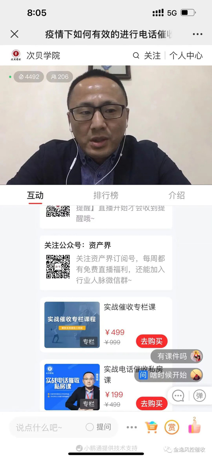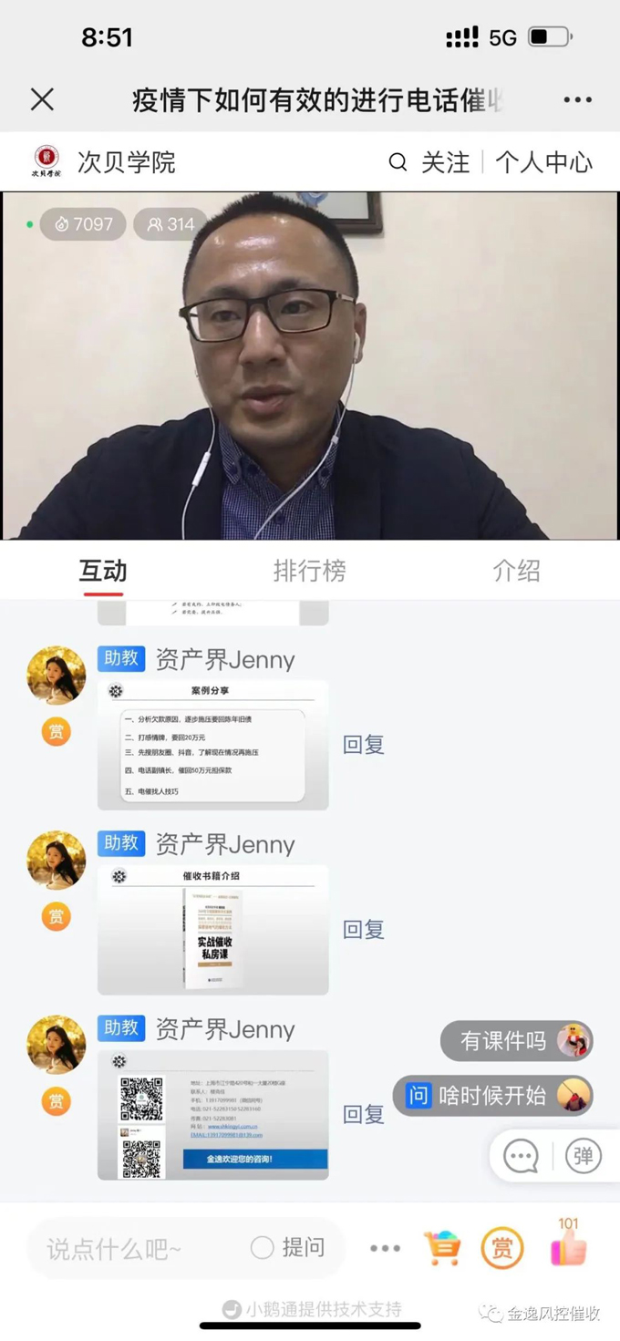 2022年本次課程視頻號(hào)加上小鵝通破千人,線上的直播培訓(xùn)以講師授課、學(xué)員互動(dòng)相結(jié)合的形式開展。樓老師通過典型的案例來解析電話催收的技巧和注意事項(xiàng),讓學(xué)員們收益匪淺,主辦方次貝學(xué)院對樓老師的培訓(xùn)表示感謝。