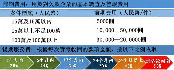 法律訴訟,往往費(fèi)錢、費(fèi)時(shí),而且無論成功與否,訴訟人都要付出一筆可觀的費(fèi)用。雖然有時(shí)獲得勝訴,但也並不意味著欠款能收回。專業(yè)的賬款管理諮詢服務(wù),能馬上為你的應(yīng)收款進(jìn)行“號(hào)脈”,並可根據(jù)客戶的要求提出解決方案,直至欠款收回,手法靈活;而在費(fèi)用方面,實(shí)行“無回款,無費(fèi)用”的服務(wù)至上原則。